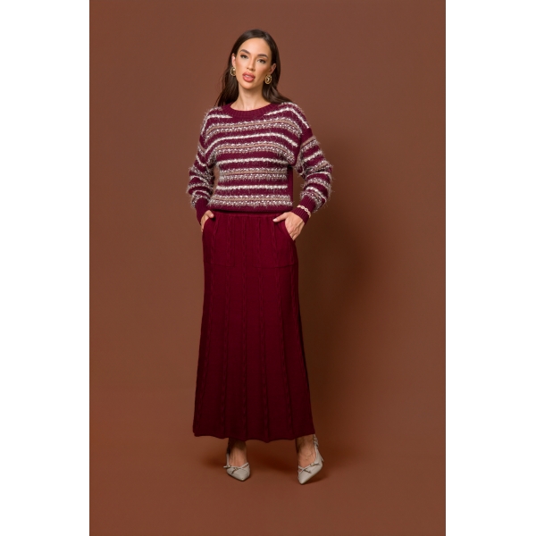 Saia com modelagem midi, trama de trança em alto relevo, possui bolsos. Saia leve e fluida.